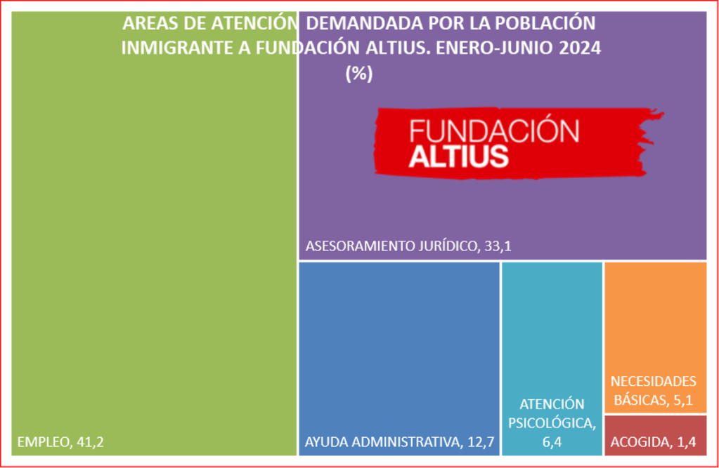 Si consideramos las atenciones realizadas al colectivo inmigrante, el empleo es la demanda atendida más numerosa, con el 41,2 %, seguida por la demanda de asesoramiento jurídico gratuito, con el 33,06 %.