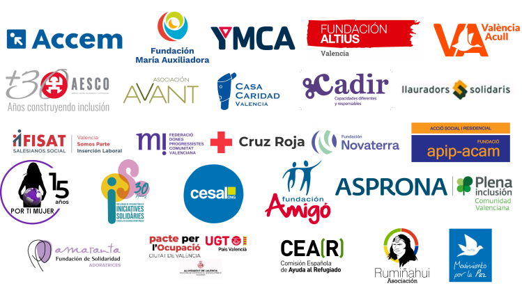 ACCEM, ACCION CONTRA EL PARO, AESCO, AGRICULTORES SOLIDARIOS, FUNDACIÓN APIP-ACAM, ASOCIACION RUMIÑAHUI, ASOCIACIÓN AVANT, ASPRONA, CADIR CASA CARIDAD VALENCIA, CEAR , CESAL, CRUZ ROJA, FEDERACIÓ DE DONES PROGRESSISTES, FISAT FUNDACIÓN ÁNGEL TOMÁS, FUNDACIÓN ALTIUS, FUNDACIÓN AMIGÓ, FUNDACION AMARANTA, FUNDACIÓN MARÍA AUXILIADORA, FUNDACIÓN NOVATERRA, HOGAR SÍ FUNDACIÓN RAIS, INICIATIVES SOLIDARIES, MOVIMIENTO POR LA PAZ, POR TI MUJER, UGT PV, VALENCIA ACULL, YMCA.