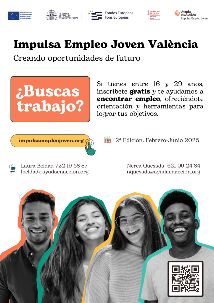 Impulsa Empleo Joven se enmarca en la convocatoria del programa del Fondo Social Europeo Plus para el periodo 2021 – 2027 a través del Ministerio de Trabajo y Economía Social. y, además, en Valencia cuenta con el apoyo y la financiación de la Conselleria de Servicios Sociales, Igualdad y Vivienda de la Generalitat Valenciana.