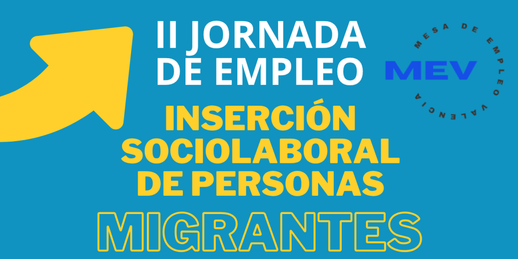Por segundo año consecutivo, las entidades que integran la Mesa de Empleo de Valencia (MEV) preparan sus jornadas de empleo. Efectivamente, la MEV presenta la II Jornada de Empleo, con el título de INSERCIÓN SOCIOLABORAL DE PERSONAS MIGRANTES.