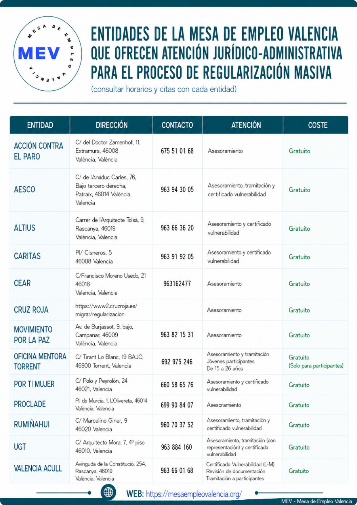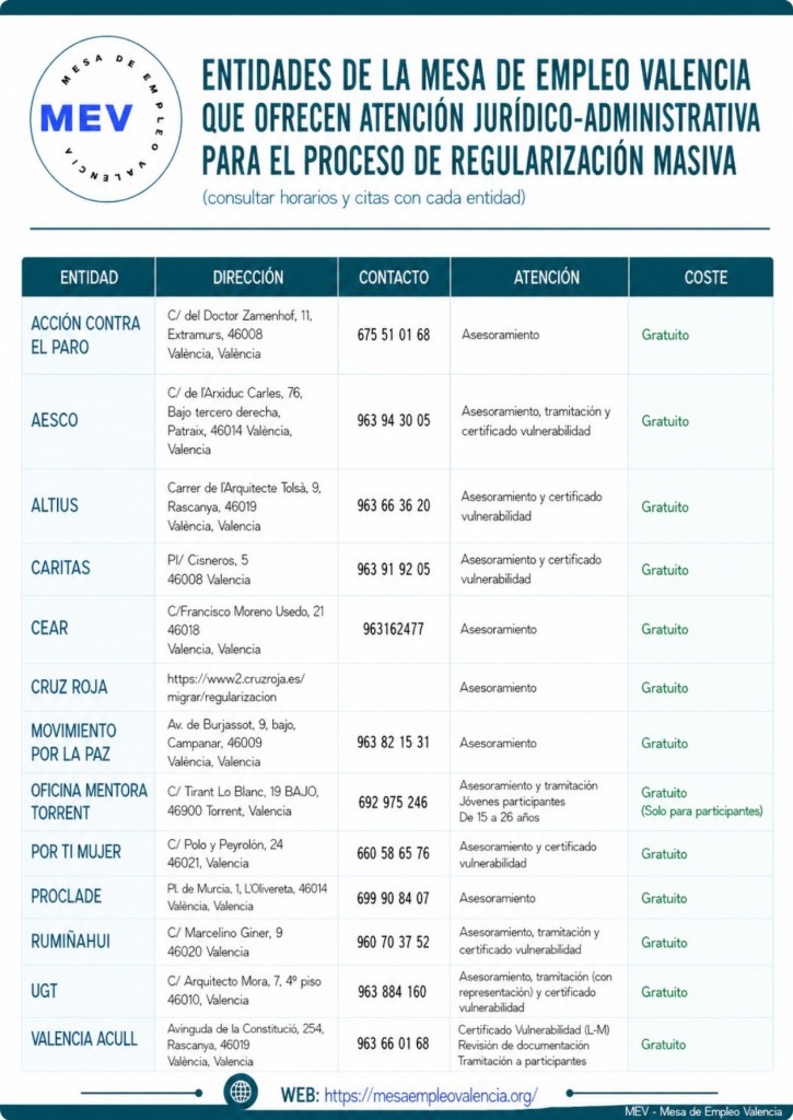 Aquí puedes encontrar un listado de entidades sociales que forman parte de la MEV que van a estar asesorando y tramitando en el proceso de regularización que empezó el jueves 16 de abril y finalizará el próximo 30 de junio 2026.