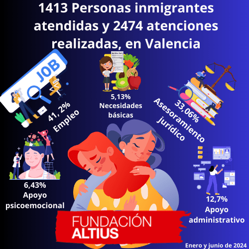 El empleo y la asistencia jurídica, las atenciones más demandadas. Fundación Altius Valencia ha atendido a 1.680 personas en los primeros cincos meses de año (de las cuales 749 son altas nuevas) y ha realizado 3.160 atenciones. El 78,2 % de las personas atendidas durante este periodo ha sido de origen inmigrante. Entre las altasSigue leyendo «8 de cada 10 personas en situación de vulnerabilidad que acuden a Fundación Altius Valencia son personas de origen inmigrante»