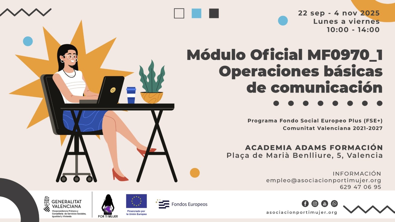 La Asociación Por Ti Mujer pone en marcha la próxima edición del módulo formativo MF0970_1 – Operaciones básicas de comunicación, que se impartirá de forma presencial del 22 de septiembre al 4 de noviembre de 2025, en horario de 10:00 a 14:00, de lunes a viernes, en las aulas de la Academia Adams Formación, ubicada en la PlaçaSigue leyendo «Asociación Por Ti Mujer: formación en «Operaciones básicas de comunicación»»