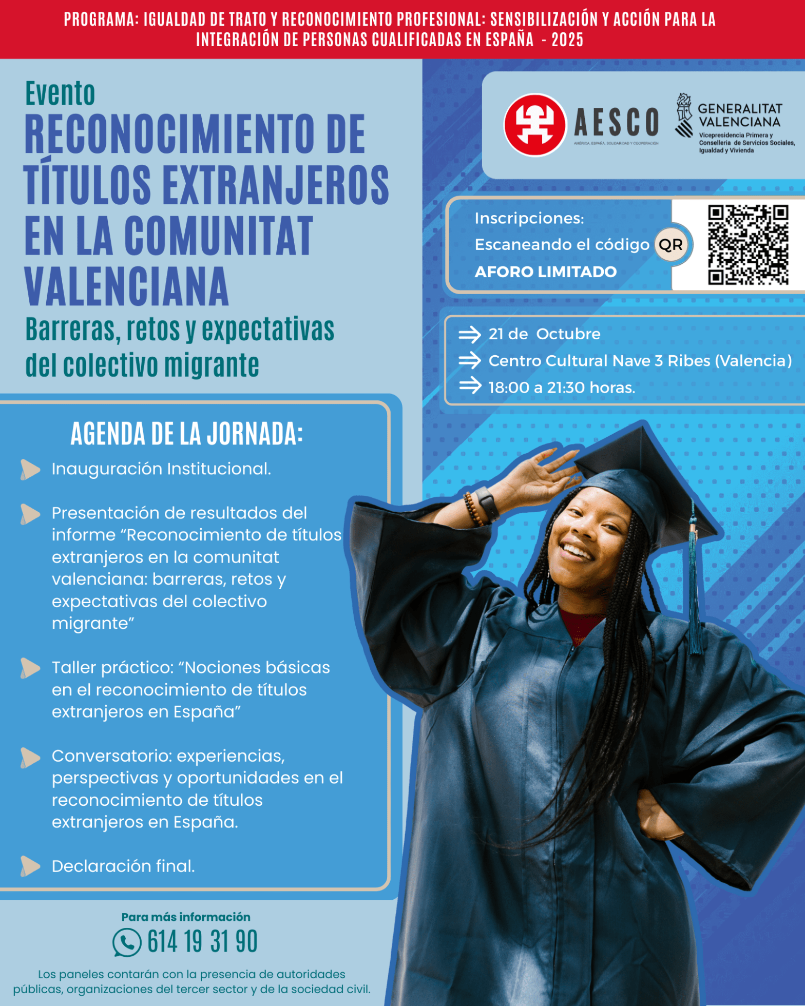 ¿Sabías que homologar tu título extranjero en la Comunitat Valenciana puede ser un proceso lleno de barreras, retos y también grandes oportunidades? En nuestro próximo evento hablaremos justo de eso: Reconocimiento de Títulos Extranjeros en la Comunitat Valenciana: Barreras, Retos y Expectativas del Colectivo Migrante. Durante esta jornada compartiremos contigo los resultados de nuestro informe,Sigue leyendo «AESCO – América, España, Solidaridad y Cooperación te invita a un encuentro único.»