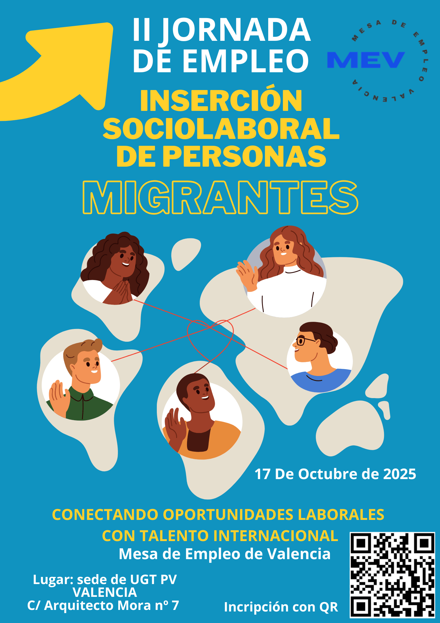 La Mesa de Empleo Valencia, organiza su II Jornada, enfocada a retos y dificultades de inserción sociolaboral para personas migrantes. Día: Viernes 17 de octubre.Nueva ubicación: Salón de Actos – UGT PV. Calle Arquitecto Mora, 7 46010 Valencia Inscripción: https://docs.google.com/forms/d/e/1FAIpQLSfW0hzRr5kEwY9btXKkiBOszLL6fwtRjVE7VXSXHHPsbfq0-A/viewform PROGRAMACIÓN DE LA JORNADA:9:00h Recepción de asistentes. 9:15h Inicio de la Jornada – Bienvenida. 9:45hSigue leyendo «II Jornadas de Empleo de la Mesa de Empleo de Valencia»